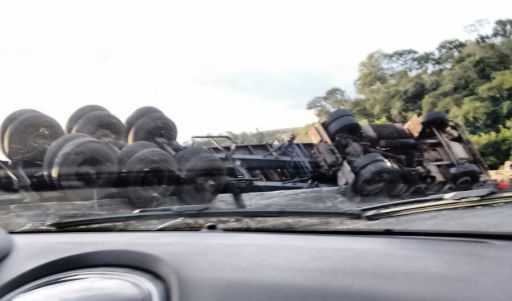 para ganhar a Fernão Dias, a BR-381, a carga pendeu para o lado e puxou o caminhão, que tombou e ficou preso pelas rodas.