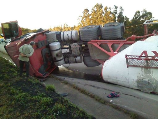 Carreta carregada com cimento a granel que tombou na tarde de ontem ainda está na pista. (Fotos: Grupo de WhatsApp "BR-265 Mata", postadas por Darley Fabiano)