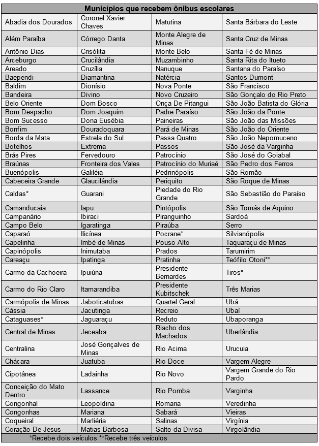 Recebem os veículos as prefeituras de Araçuaí, Arinos, Governador Valadares, Nanuque, Patrocínio, Porteirinha, Ribeirão das Neves, Rosário da Limeira, Sacramento e São João Del Rey. Nos 10 veículos, adquiridos por meio de convênio entre a Secretaria de Estado de Desenvolvimento Agrário e o Ministério de Desenvolvimento Social e Combate à Fome, foram investidos cerca de R$ 1,1 milhão.