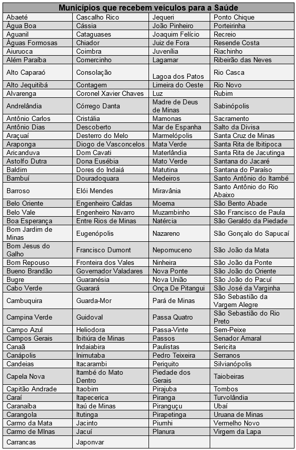 Com investimento de R$ 7,47 milhões, foram entregues para 170 municípios mineiros 181 veículos destinados à assistência à saúde. A entrega faz parte do Programa de Doação de Veículos para Atenção à Saúde dos Municípios do Estado de Minas Gerais, lançado no ano passado, que contempla prefeituras e entidades filantrópicas credenciadas como prestadores de serviço ao Sistema Único de Saúde (SUS). Até o momento foram disponibilizados 1.157 veículos para todas as regiões do Estado.